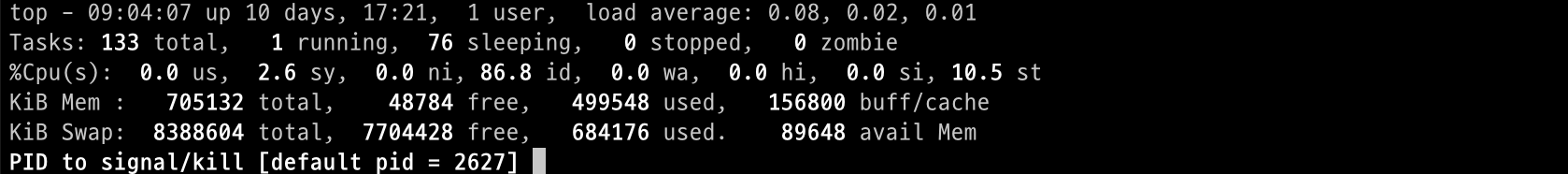 top를 통해 프로세스를 모니터링하며 프로세스를 종료해야겠다고 생각할 수 있습니다. 이때 top에서는 top화면을 보며 프로세스를 종료할 수 있는 기능을 제공해주고 있습니다. 해당 기능을 사용하기 위한 커맨드는 k입니다.