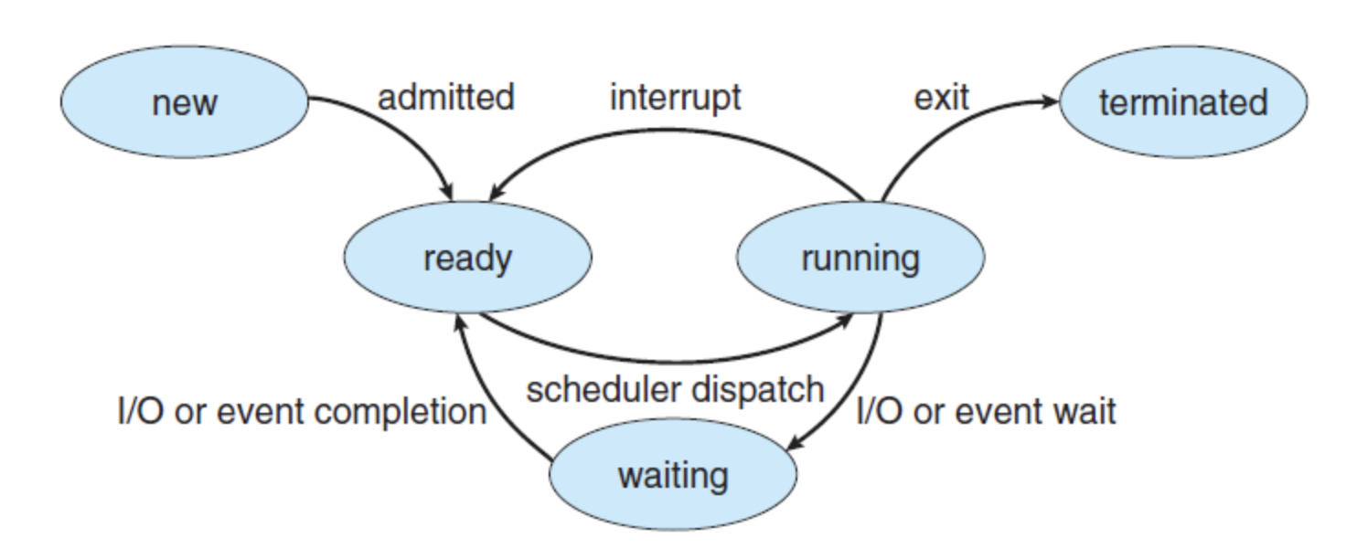 프로세스는 일반적으로 IO 기반의 일(IO bound)과 CPU 기반의 일(CPU-bound)을 번갈아 가면서 수행하게 됩니다. 이러한 프로세스의 상태는 일반적으로 아래와 같습니다. IO 기반의 일을 하게 될 때는 CPU는 idle 타임(프로세스가 잠을 자는 상태)에 들어가게 됩니다. 또한 프로세스 스케줄링 알고리즘에 의해 프로세스는 번갈아가면서 실행되게 됩니다. 이렇게 멀티테스킹 작업을 시도하는데 이때 프로세스에는 아래와 같은 상태의 변동이 있습니다.