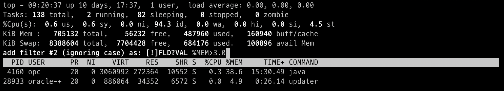 %MEM값이 3% 이상인 프로세스만 확인