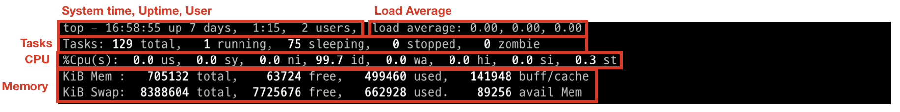 요약 영역은 top에서 상단에 위치하고 있습니다. 이 요약영역은 전체 프로세스가 OS에 대해서 리소스를 어느정도 차지하고 있는지를 알려줍니다. 요약 영역에 나타나는 대표적인 값은 시간, 유저, 로드 에버리지(Load Average), 테스크(Tasks), CPU, 메모리(memory)로 아래의 이미지를 보시면 각 영역에 대해 나태내느 값이 어디에 위치하는지 알 수 있습니다.