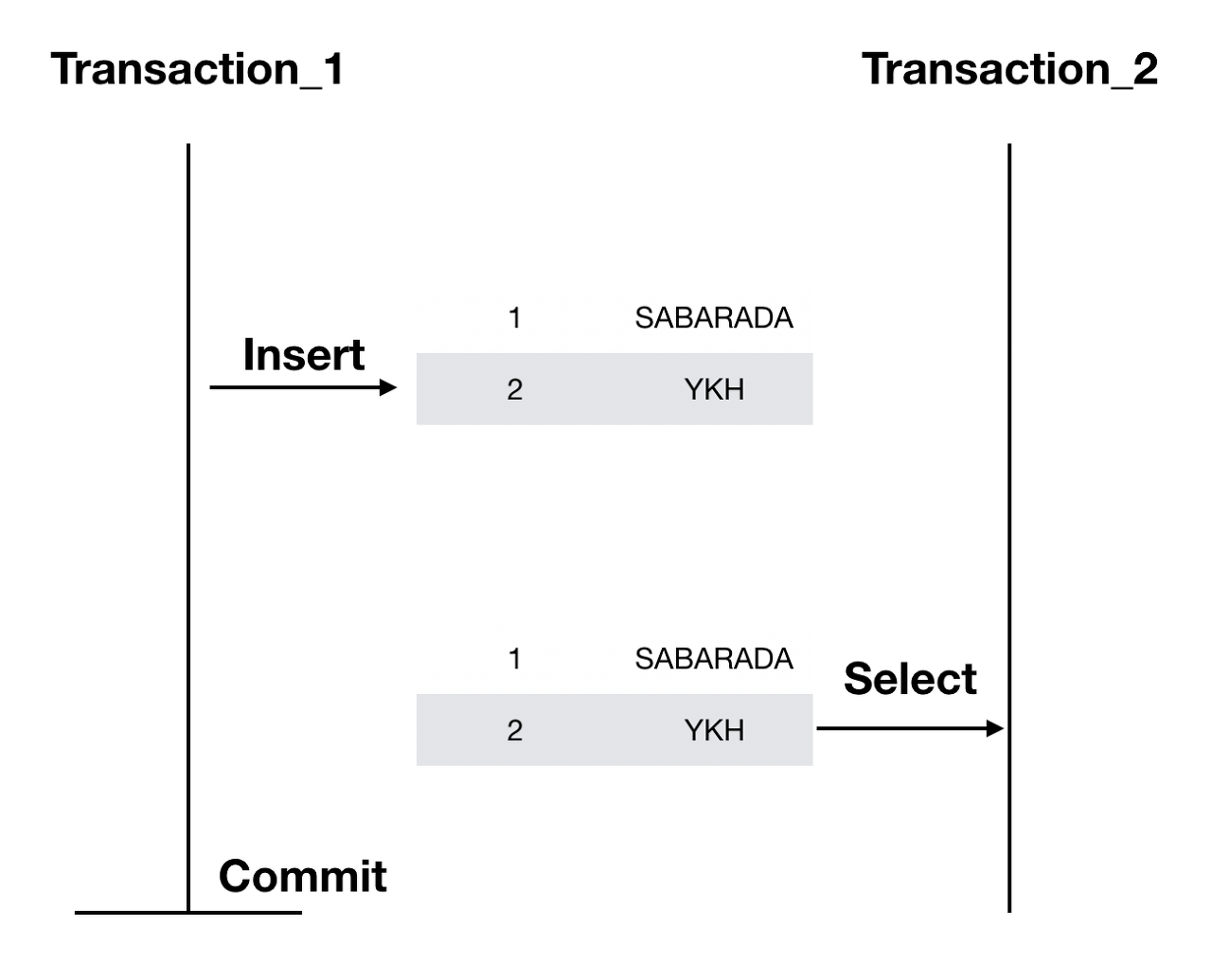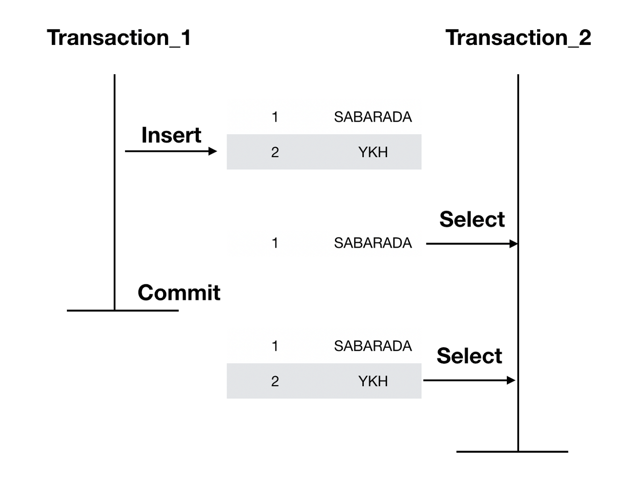 Read uncommitted 와는 다르게 select for update, delete 구문 실행 후, commit 된 데이터를 읽어 들인다.
