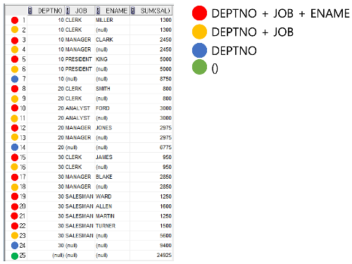 GROUP BY ROLLUP(DEPTNO,JOB,ENAME);