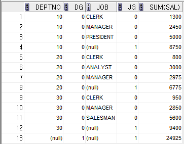 숫자가 들어간 ROLLUP은 뭘까요? 결과를 보니 마지막 2개의 줄이 같은 값이 나왔습니다. 헷갈릴 수 있지만 ROLLUP의 원리를 생각해보면 별 다를것 없습니다. JOB과 DEPTNO가 ROLLUP에서 빠지고 1만 남았을때 SUM(SAL)을 구하려고 합니다. 상수에 대한 GROUP은 없습니다. 즉, 전체 행에 대한 결과를 출력하라는 의미와 같습니다.
